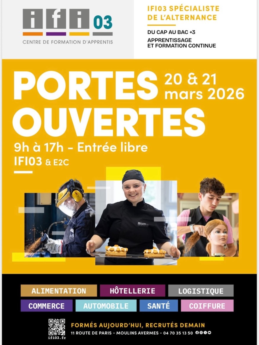 Samedi 21 mars 2026, de 9 h à 17 h, l’IFI 03 – Institut de Formations Interprofessionnel, situé à Moulins-Avermes, invite le public à découvrir son campus et ses formations lors de sa deuxième journée de portes-ouvertes.